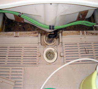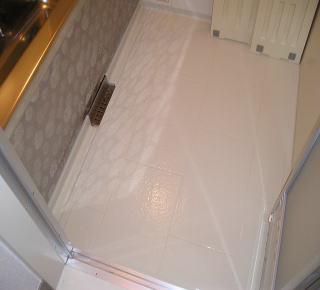 皮脂や石鹸カスなどで黒く汚れてしまったバスルームの床です。